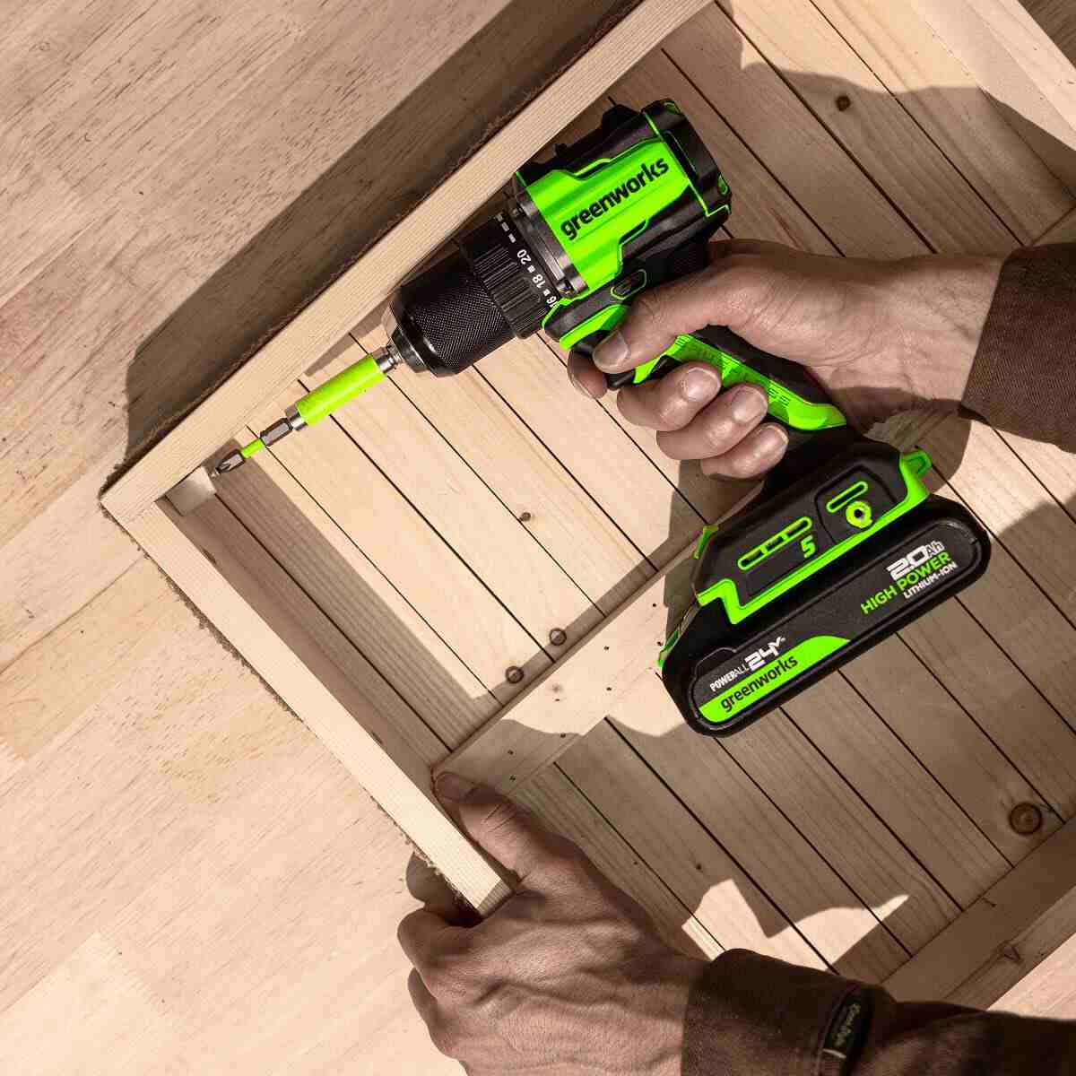 Дрель-шуруповерт Greenworks DD560 работает от литий-ионной батареи c напряжением 24В, подходящей ко всем устройствам Greenworks платформы 24V.