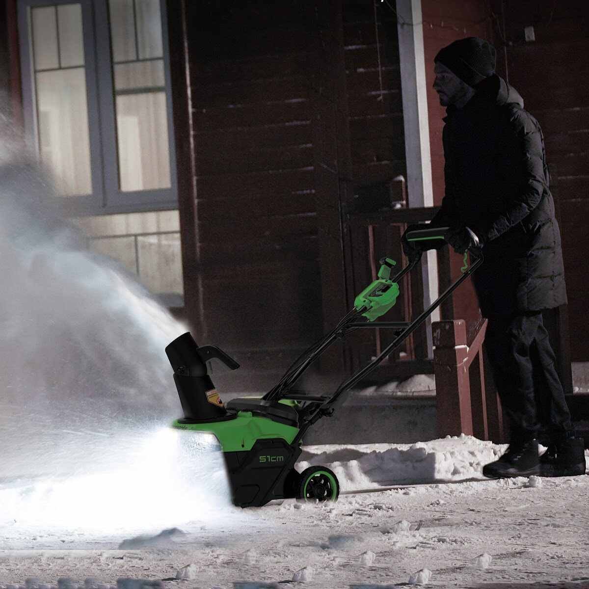 Аккумуляторный снегоуборщик Greenworks GD40STX2 линейки 40V — мощная новинка 2025 года с шириной захвата в 51 см для расчистки снега с территории перед домом, парковок, садовых дорожек и других поверхностей.